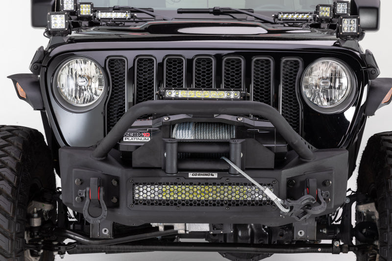 Part of Go Rhino's famous Jeep Bumper family of products. Rockline Winch Ready Front Stubby Bumper for Jeep JK, JL and JT with signature hex mesh LED protective cover for use with industry standard 20" double row LED bar or up to 4 standard 3" cube LEDs and a fully welded override light mount bar. Rockline Bumpers come with a Limited Lifetime warranty on materials and construction and a 5 year warranty on the Textured Black Finish.
