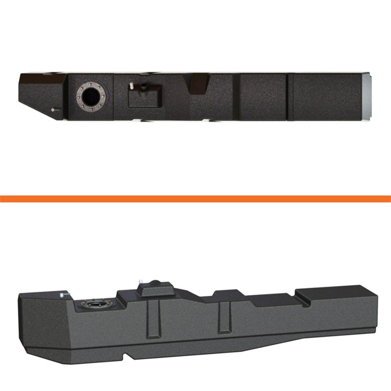67 Gallon*, extra heavy duty cross-linked polyethylene fuel tank. Tank comes complete with powder-coated or plated steel mounting strap set, extruded rubber mounting bushings, vent hoses, rollover safety vent valve, high-strength mounting bolt set, seals and required clamps.Tank features exclusive low fuel trap design. For Crew Cab equipped vehicles with 8.0 ft. Long Beds. The tank also includes a heavy-gauge steel nose skid plate. This plate protects the transmission and transfer case of the vehicle as well as supports and secures the large tank in place.•LIFETIME WarrantyFor model years 1999-2007. For F250 HD, F350 HD, and F450 HD Models with Power Stroke Engines.•Please Note: there is no shield for this tank